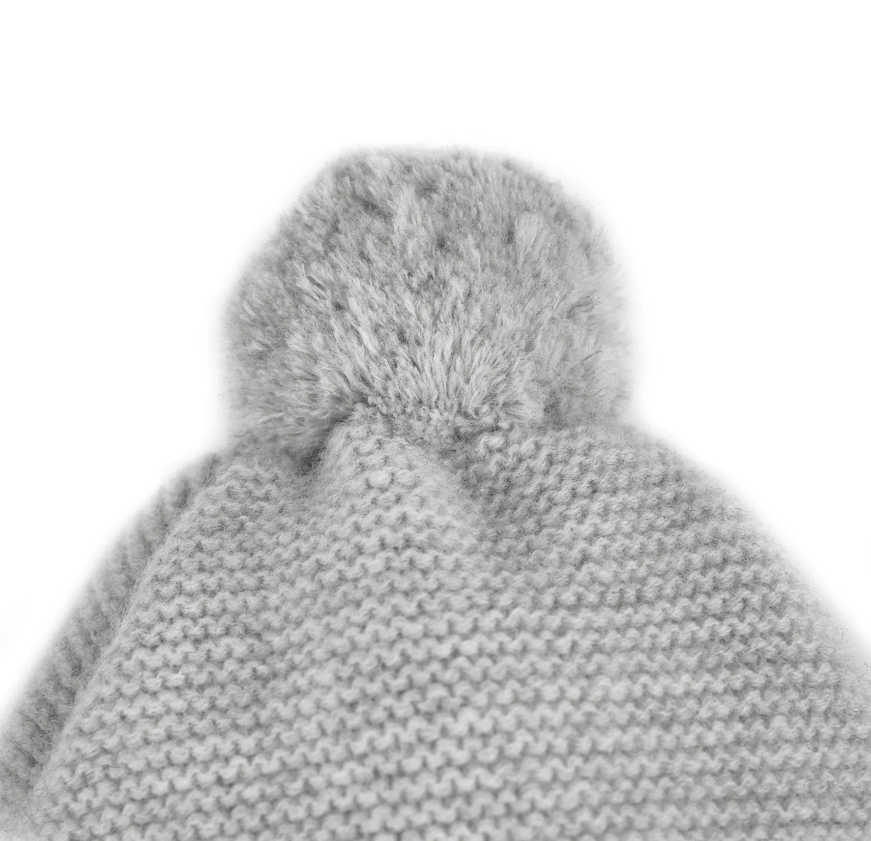 Bommelmütze für Babys aus Merinowolle und Kaschmir in hellgrau mit Bindebändern