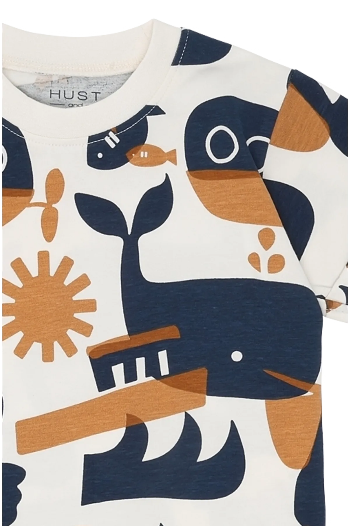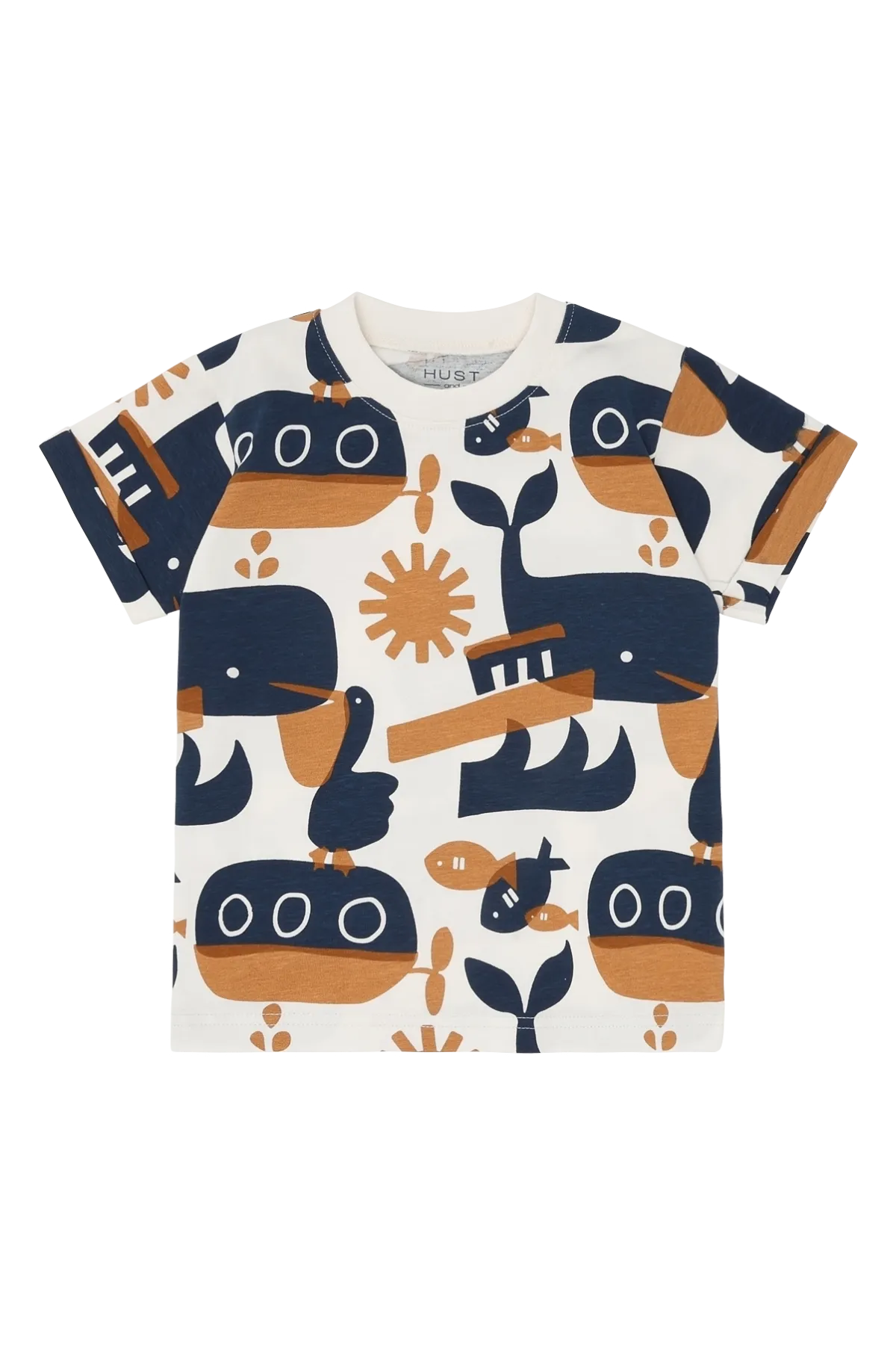 Das HCAnton Oceanlife T-Shirt von Hust & Claire ist ein charmantes weißes T-Shirt aus weicher Baumwolle mit Elasthan. Der fröhliche Allover-Print zeigt Wale, Pelikane, U-Boote und Fische in Dunkelblau und Hellbraun – perfekt für kleine Entdecker und Meeresliebhaber.