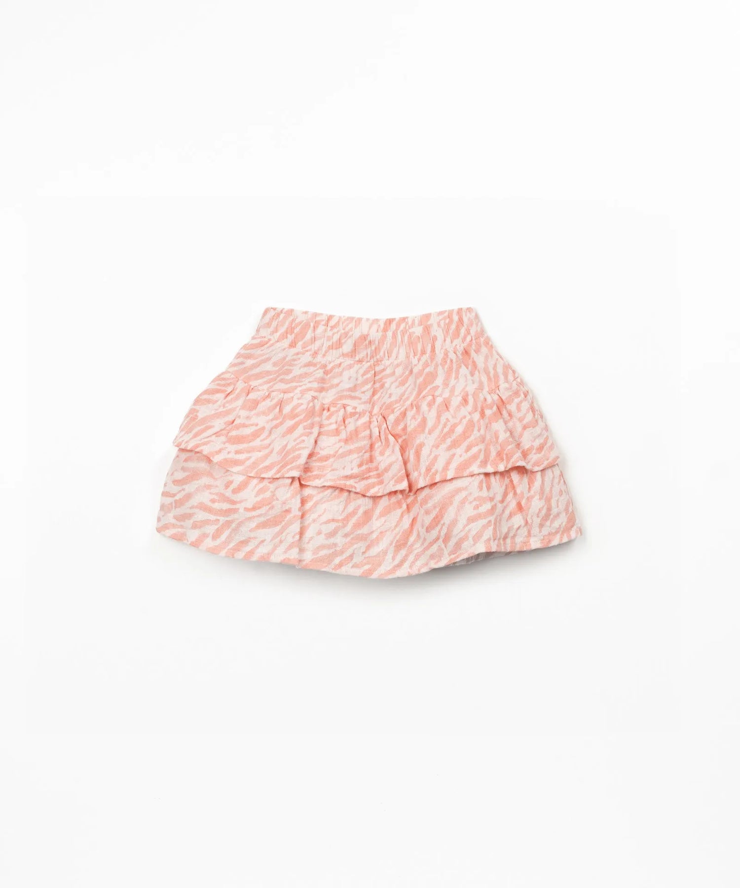 gewebter Stufenrock für Mädchen mit korallenfarbenen Zebra-Muster, integrierter Shorts und breitem Gummibund aus 100% Bio Baumwolle, Ansicht von vorne