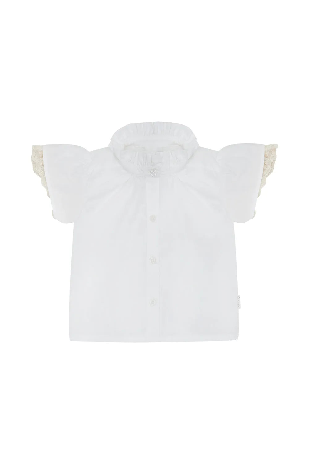 Die eingearbeitete Spitze am Ärmelsaum und der gerüschte Stehkragen sind mit viel Liebe zum Detail gefertigt. Diese romantischen Elemente machen aus einer einfachen Bluse ein besonderes Kleidungsstück, das kleine Mädchen strahlen lässt.