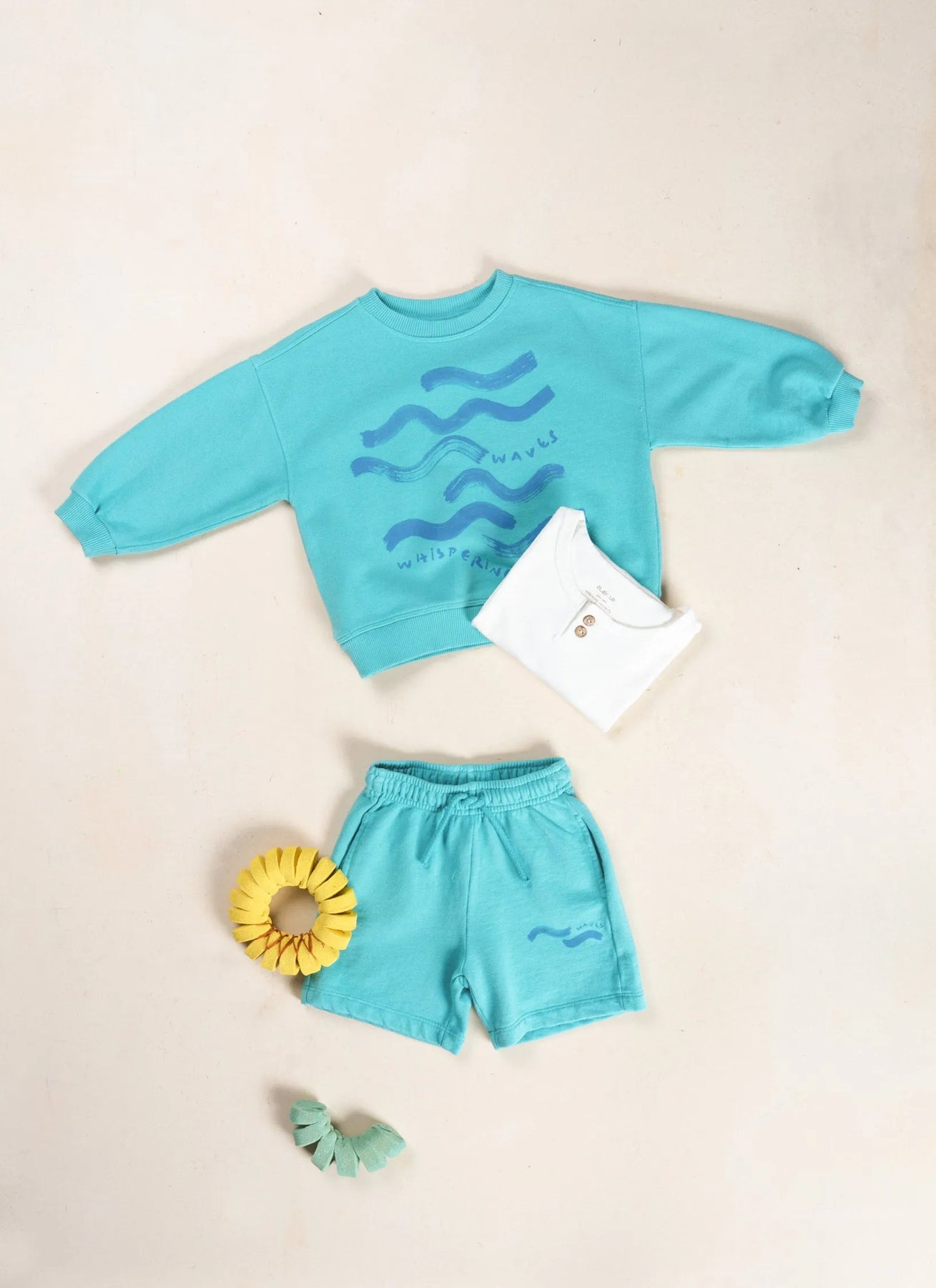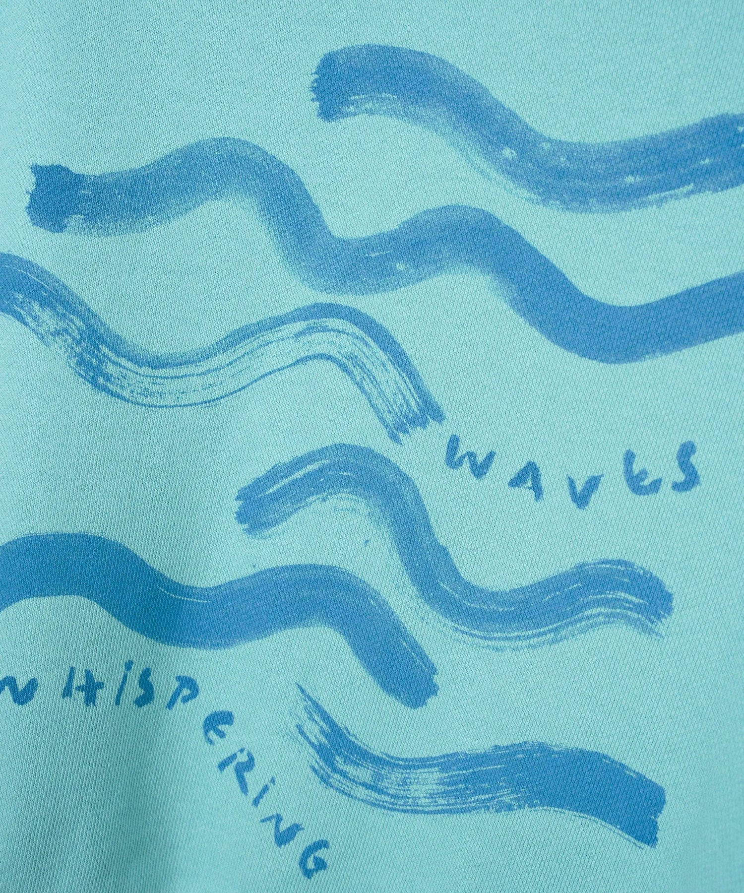 türkisfarbener Fleece Sweater für Jungen mit blauem Wellen-Print auf der Vorderseite, Rundhalsausschnitt, oversized Style, gerippte Bündchen