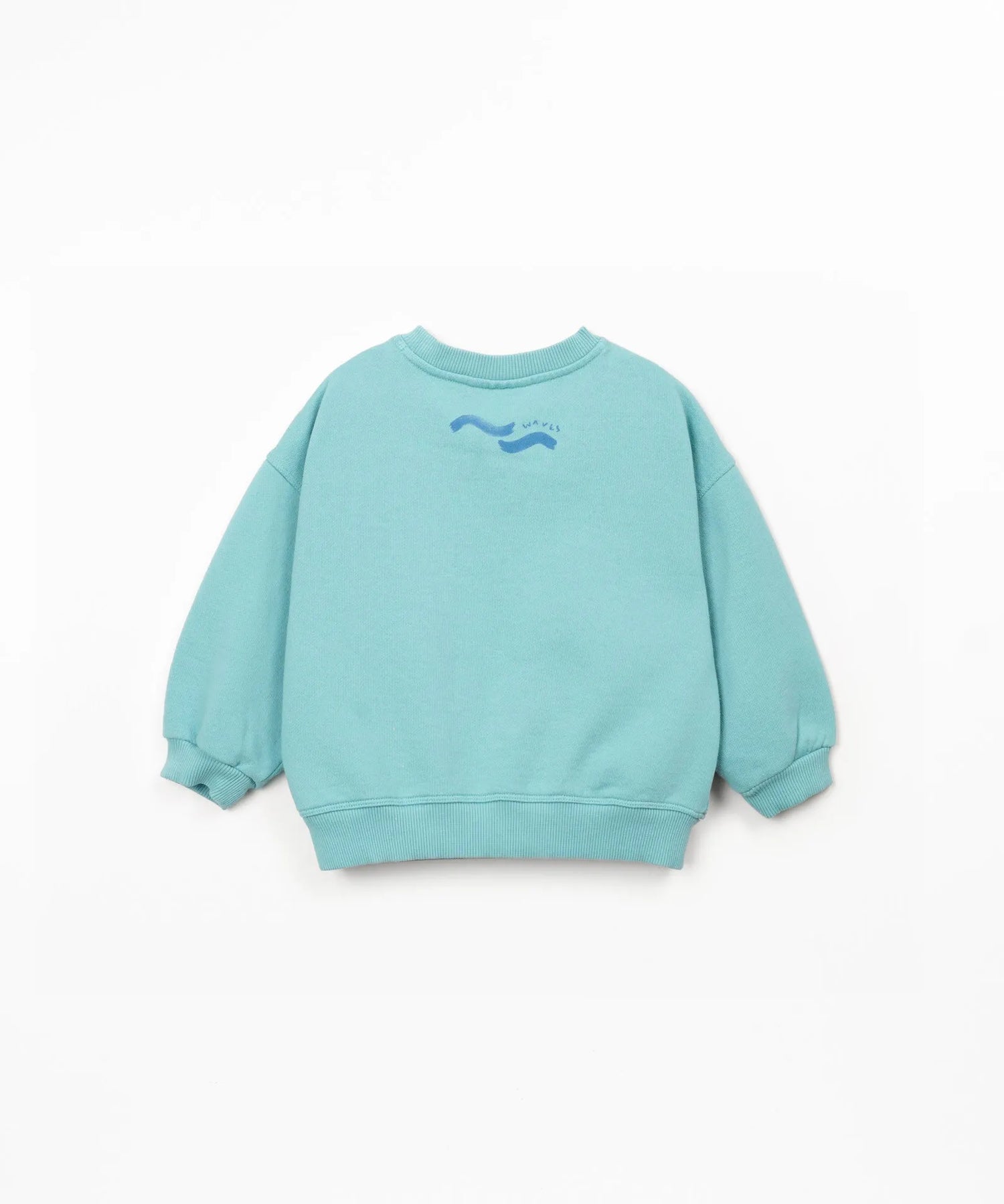 Der Fleece Sweater vase von Play Up vereint lässigen Oversized-Style mit butterweichem Tragekomfort. Der türkisfarbene Pullover mit seinem maritimen blauen Wellen-Print auf der Vorderseite ist der perfekte Begleiter für kühle Tage, Outdoor-Abenteuer und gemütliche Momente.