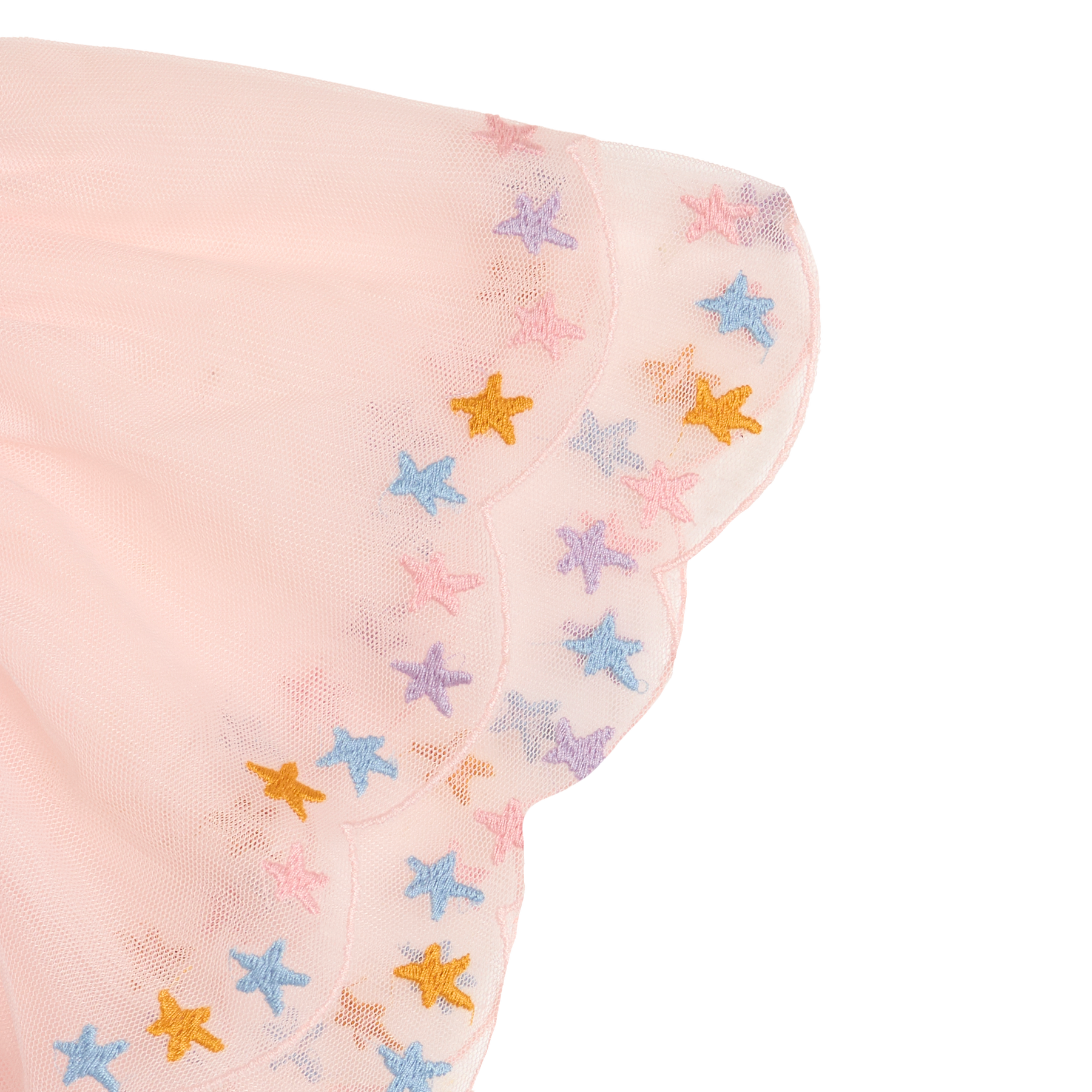weißes T-Shirt für Mädchen aus Baumwolle mit Rundhalsausschnitt und dünnen rosafarbenen Ärmeln aus Tüll in zwei Lagen mit aufgestickten bunten Sternen, Produktbild, Ansicht von vorne